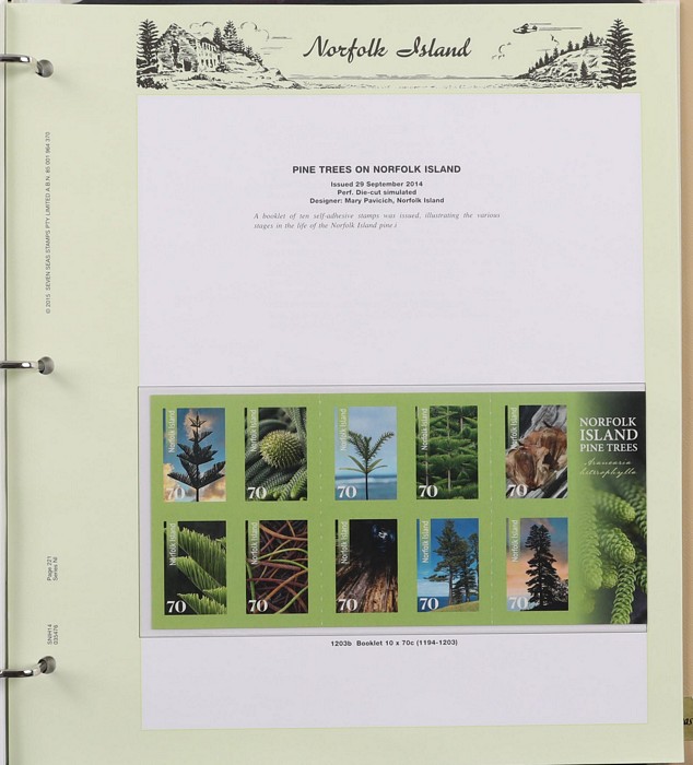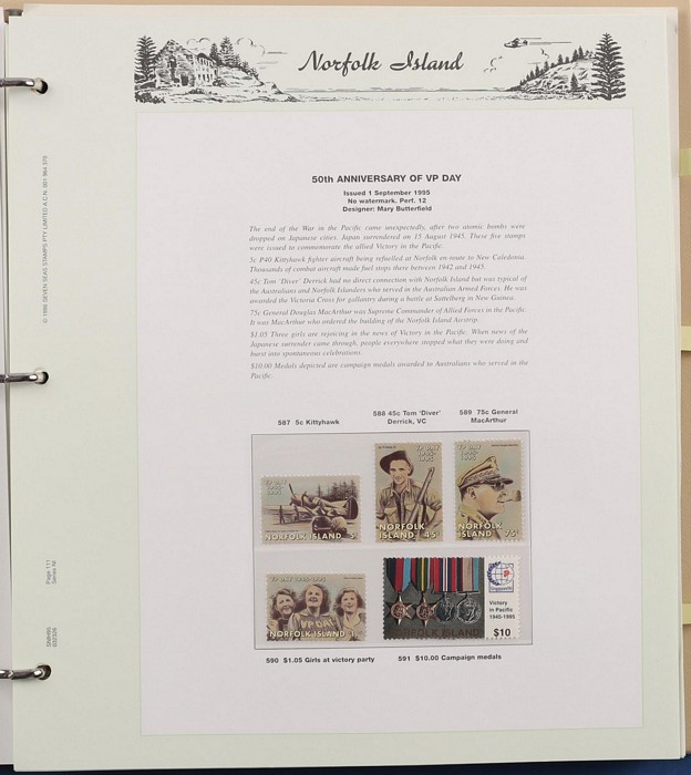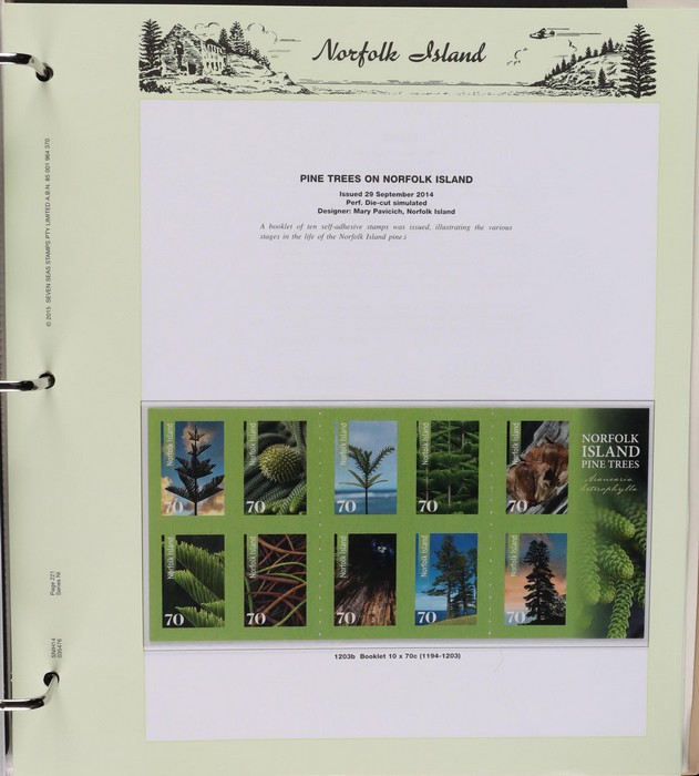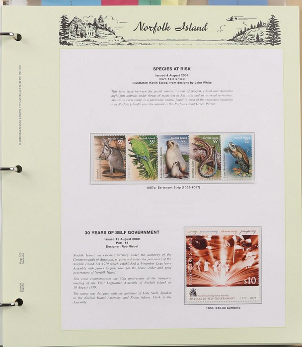 937 imageNorfolk Island 1947-2014 M/MNH collection in 2 Seven Seas slipcase albums (hingeless 1978 on, retail $600). Inc 1947 Ball Bay set inc white paper set of 4 MLH, 1960 Pic set MNH, also 10/- opt Specimen (4) 3 MNH/1 MLH (3 diff opt types). Post 1966 comprehensive MNH through to 2014 sets, M/sheets & booklets with some extras inc 1997-2003 selection of Counter Printed Stamps (FV $31) etc. FV $1170, plus high cost of the albums, $600+. Largely VF. (Image1) (Image2) (Image3) (Image4) (Image5) (Image6) (Image7) (Image8) (Image9) (Image10) (Image11) (Image12) (Image13) (Image14) (Image15) (Image16)