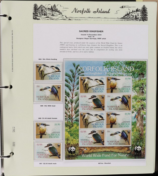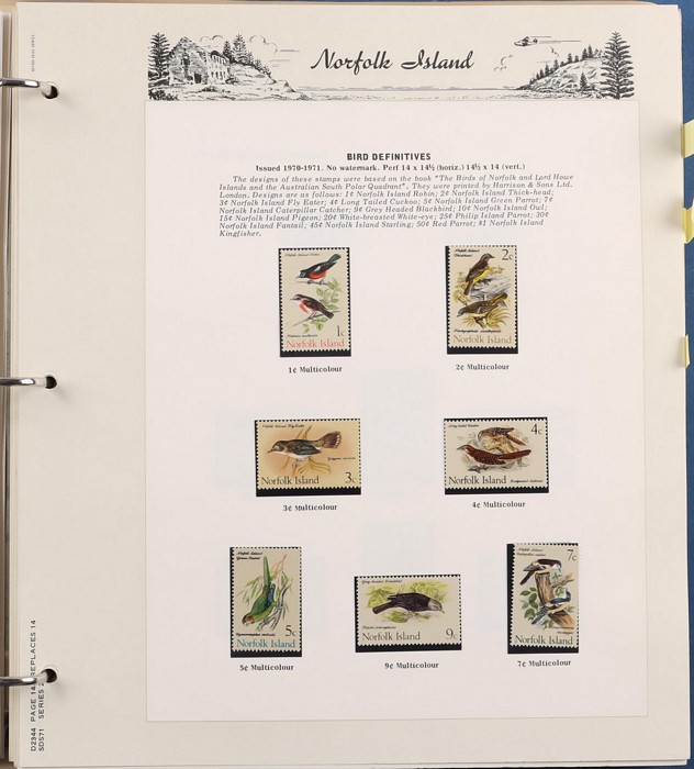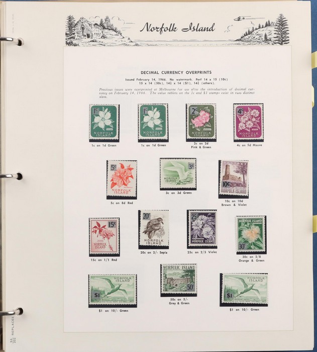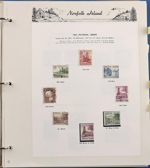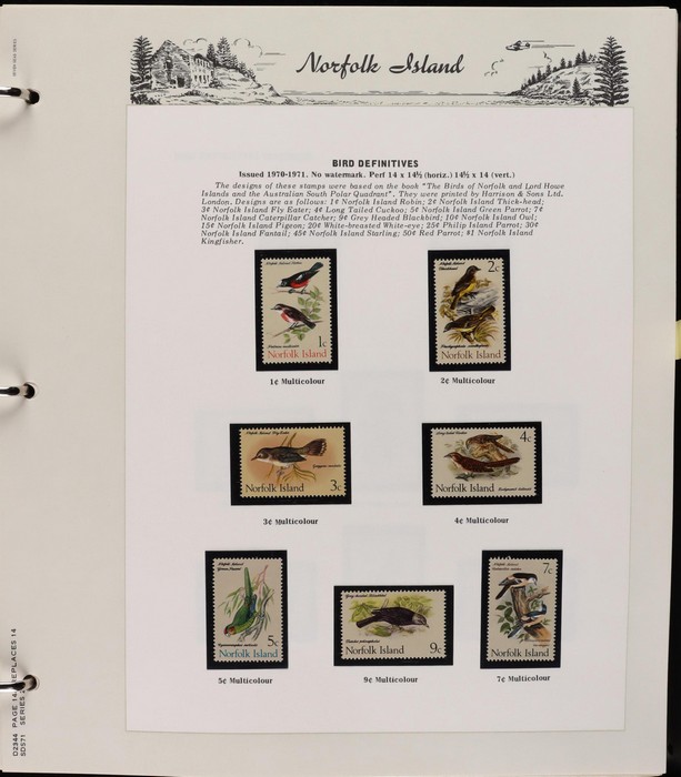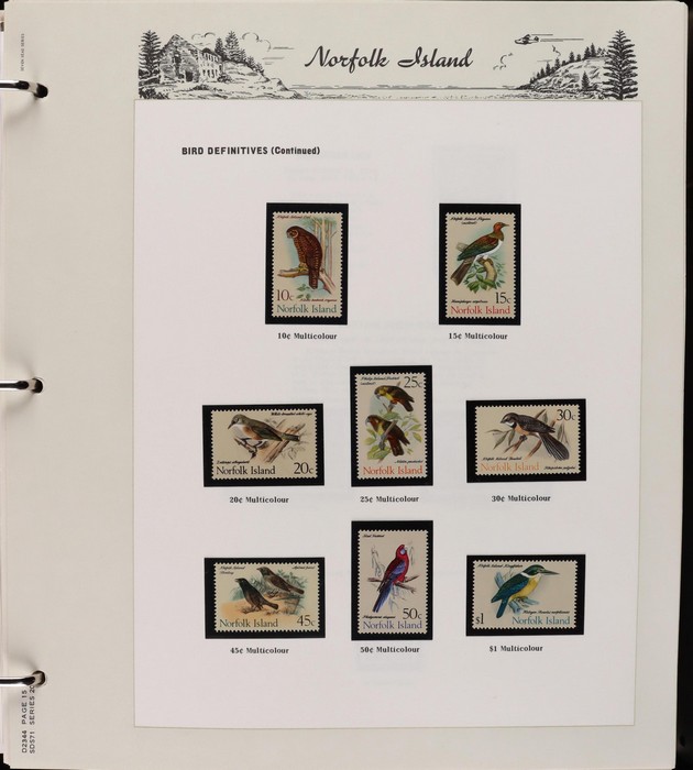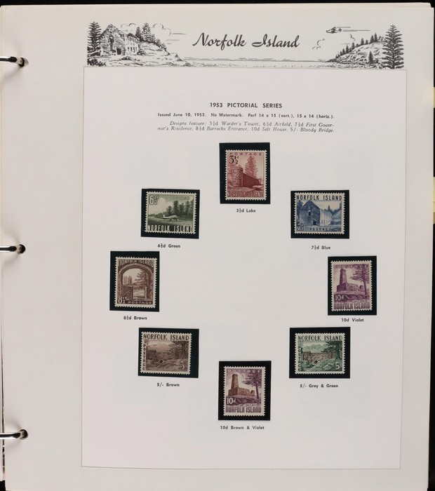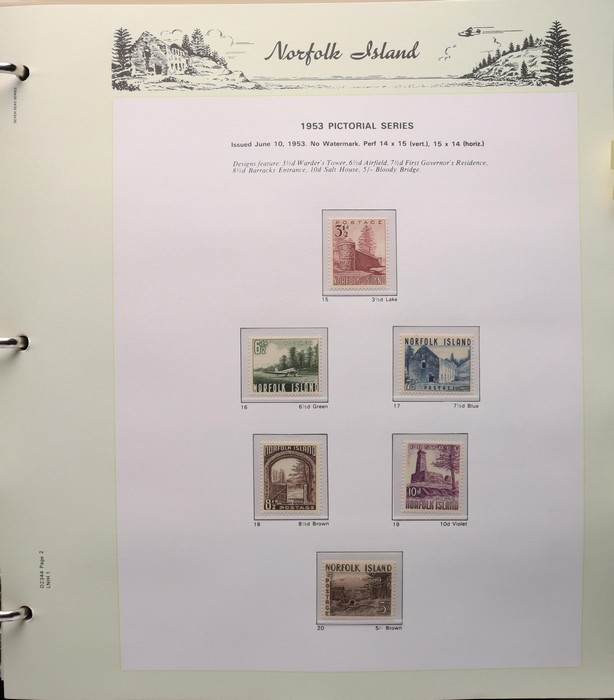 932 imageNorfolk Island: 1947-2014 near comp MNH collection in Seven Seas pages (hingeless 1987-2014, retail $440) inc 1947 Ball Bay set to 2/- blue MLH, 1953 Pics to 5/- brown Bridge (VFU), 1960 Defs to 10/- Bird plus extra 10/- (2) opt SPECIMEN, 1960 Local Govt 2/8, 1966 opt set, 1967 Ships, 1969 Birds, 1974 UPU M/Sheet & many other decimal MNH Pic/Commem sets inc vals to $5. Retail $1000 to end 19990, FV $800 from 1991-2014 plus another $440 for the albums, total $2240. (Image1) (Image2) (Image3) (Image4) (Image5) (Image6) (Image7) (Image8) (Image9) (Image10) (Image11) (Image12) (Image13) (Image14) (Image15) (Image16)