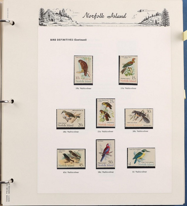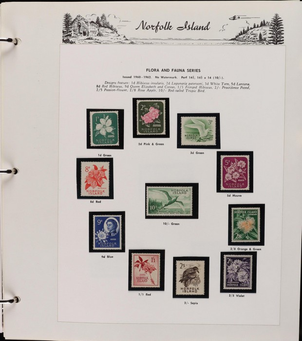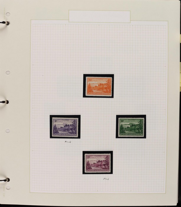935 imageNorfolk Island: 1947-92 MNH collection in Seven Seas illustrated album with 1947 Ball Bay set to 2/- green plus ½d, 1d, 1½d, 2d white papers. 1953 Pic set to 5/- brown Bridge. 1960 Defs to 10/- Bird plus extra 10/- opt SPECIMEN, 1960 Local Govt 2/8, 1966 opt set, 1967 Ships, 1969 Birds, 1974 UPU M/Sheet, 1987 Scenes & Ships to $5. All F-VF MNH, retail $1000. (Image1) (Image2) (Image3) (Image4) (Image5) (Image6) (Image7) (Image8) (Image9) (Image10)