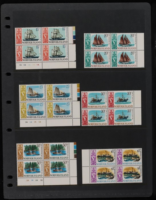 928 Norfolk Island: 1967-68 Ships set 1c to $1 in full sheets of 50 with Plate Numbers & colour bars of LR cnrs. Fresh MNH. SG 77-90 cat £550 = A$1100, retail $750, both as singles plus premium for comp sheet. (14 sheets, 700 stamps).