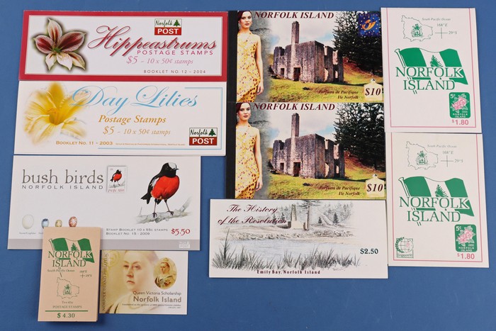 949 imageNorfolk Island: 1991-2009 Booklets collection inc 1991 Radio, 1995 Flowers, 1995 Singapore Exhib, 1999 Australia 99, 2001 Premium Perfume $10 plus 2001 Belgica Exhib opt, 2003 Lilies, 2004 Flowers, 2007 QV & 2009 Birds. VF fresh MNH. FV $47 alone. SG ex SB1-SB24 & SP1 cat £87. (10 bklts) (Image1)