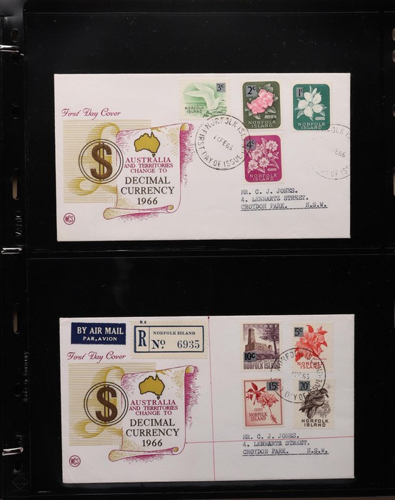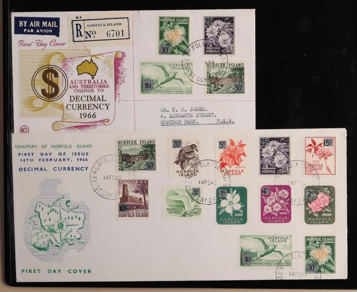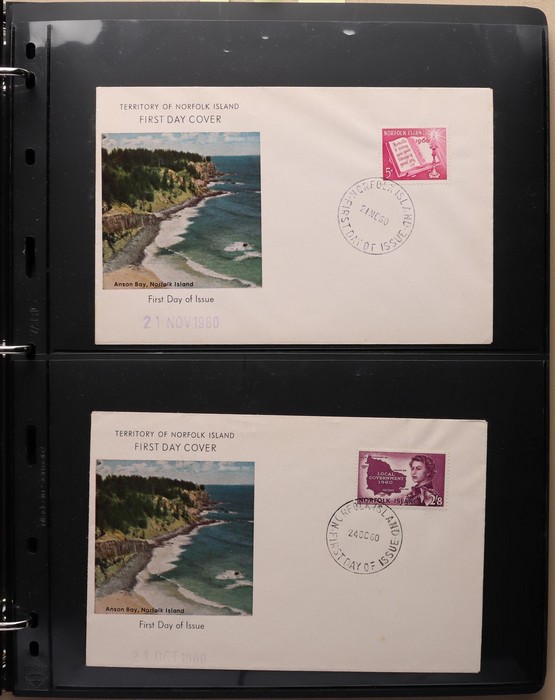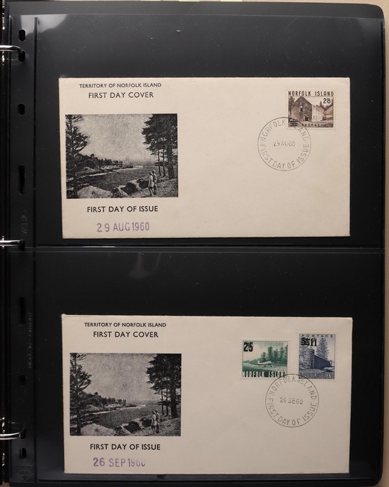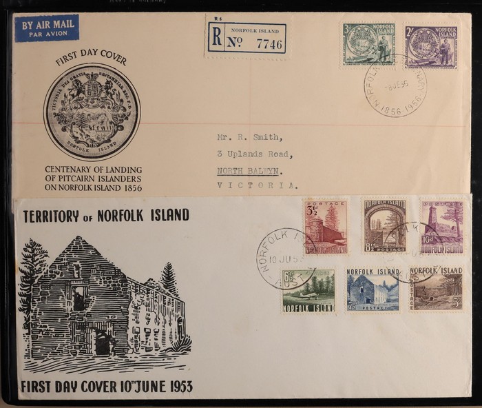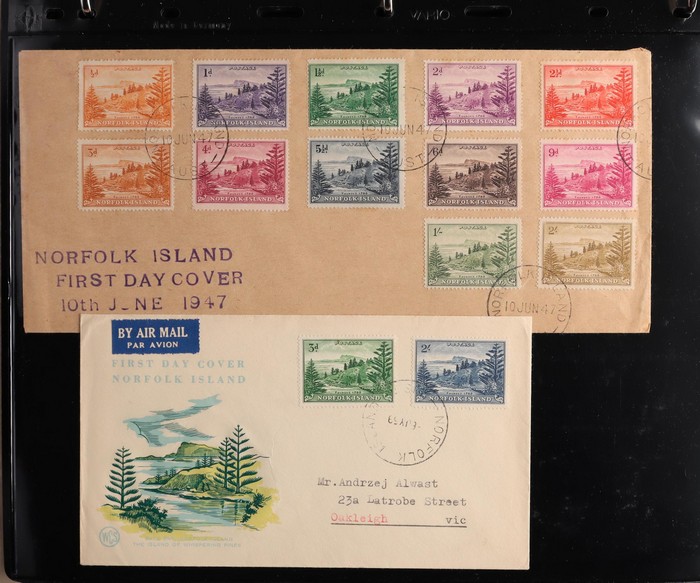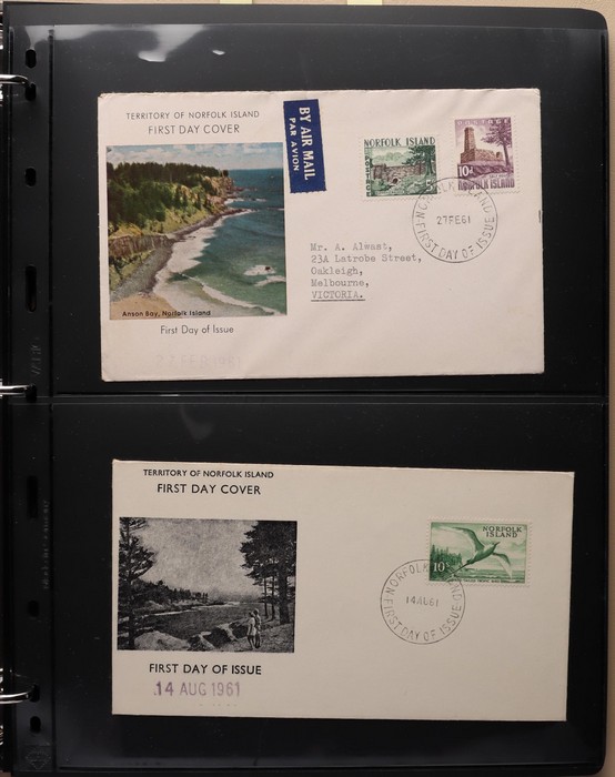 952 imageNorfolk Island: Covers 1947-1966 FDC collection (36) inc Ball Bay set of 12 on single env, 1953 Pic set to 5/- 1955 Pitcairners pr, 1958 Ball Bay 3d green, 2/- blue (scarce), 1960 Local Govt, 1960 Defs to 10/-, 1960 Provisional trio 1963 Fish, 1964 Scenes & 1966 opt sets (2). All fresh & clean. Mostly un-addressed, retail $360. (Image1) (Image2) (Image3) (Image4) (Image5) (Image6) (Image7) (Image8)