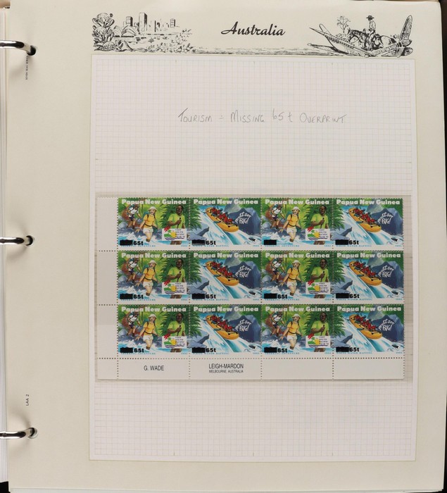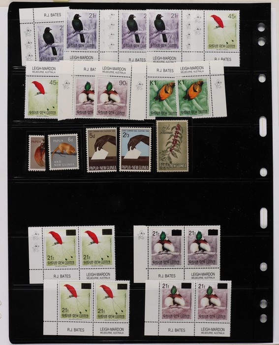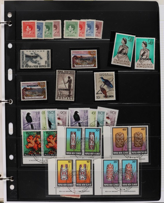 959 imagePapua New Guinea: 1952-90s specialised collection/accumulation on Vario pages in 2 binders inc 1952 Defs to Fisherman £1 VF MNH, another set MLH, & imprint prs & blks of 4 inc 10/- Map pr, £1 prs (2), plus 10/- & £1 Specimen, 1963 Pics to QEII £1, inc 10/- & £1 blks of 4, 10/- & £1 Specimens, range of By Authority imprint blks, 1964 Birds to 10/- singles & some blks, 1966 Butterflies, 1968 Shells singles & comp to $2 blks of 4, 1960 Postal Charges range inc (4) 6d on 7½d blue (SG cat £45 ea), 1960 Postal Charges in singles & blks, small range of Australian stamps used in PNG 1947-52 on piece with various town cds. Then range from 1970s-90s in singles, blks CTO/MNH, 1980s PO packs, coil strips & a few covers, (4) 1970s stamp booklets inc 1973 INTERPEX (SG cat £120). This is a large collection with a lot of potential. Many VF MNH/CTO some VF MLH, some aging on earlies. SG est cat £3000+ =A$6000. (3500+, 4 s/books) (P) (Image1) (Image2) (Image3) (Image4) (Image5) (Image6) (Image7) (Image8) (Image9) (Image10) (Image11) (Image12) (Image13) (Image14) (Image15) (Image16) (Image17)