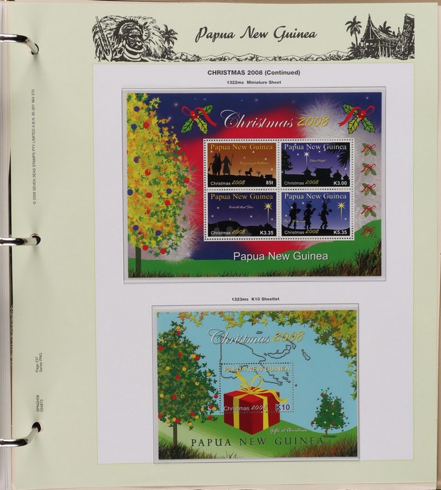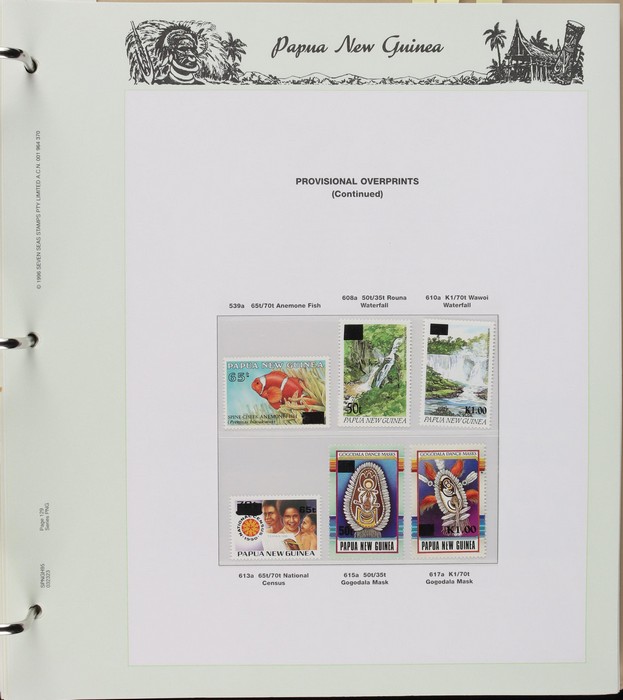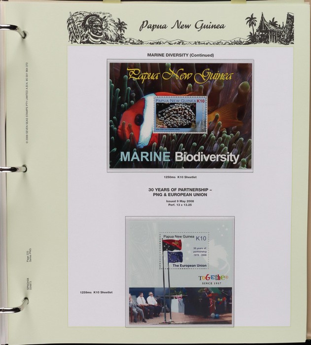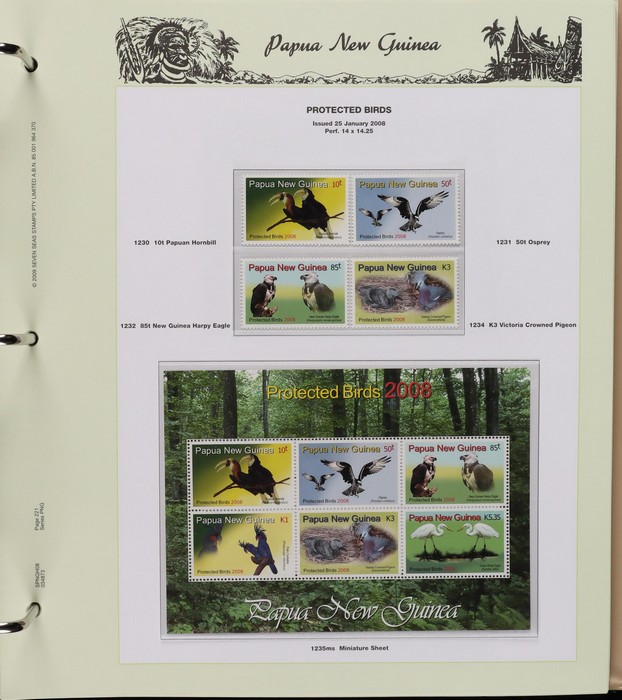 956 imagePapua New Guinea 1952-2008 M/MNH collection in 2 Seven Seas illustrated albums (hingeless 1981 onwards, retail $400) with 1952 Pics to £1 Fisherman plus 10/-, £1 opt SPECIMEN MLH, 1963 Pics to QEII £1 plus SPECIMEN opts 10/- (2 diff) & £1 (2 diff) MLH. 1964 10/- Bird Specimen MNH, mid 1970s-2008 comprehensive MNH. Inc 1994 Provisionals set of 11, 1995 Tourism 65T Surch blk of 12, one with '65 T' omitted. Then comprehensive MNH sets & M/sheets to 2008 post 1980 FV 1700 Kina = A$650. (1000+, 75 M/S) (Image1) (Image2) (Image3) (Image4) (Image5) (Image6) (Image7) (Image8) (Image9) (Image10) (Image11) (Image12) (Image13)