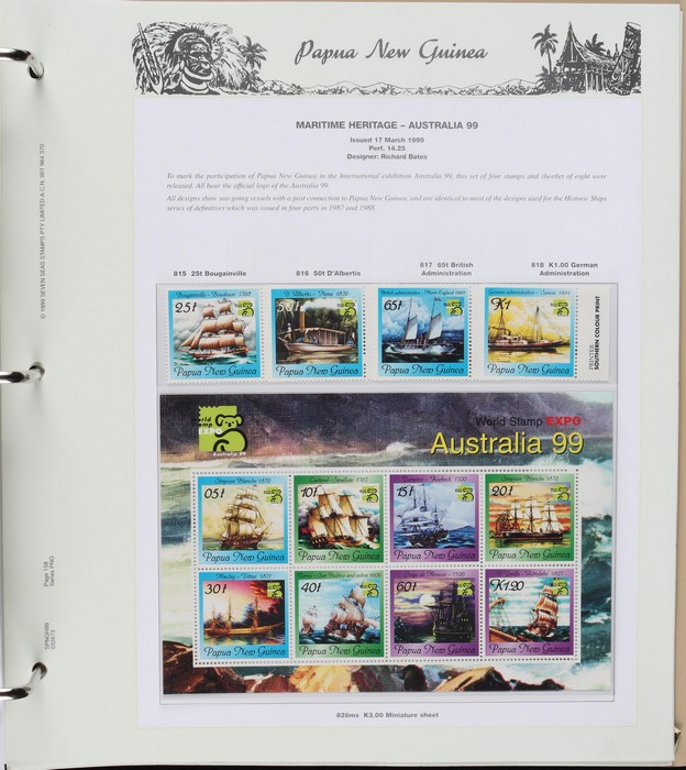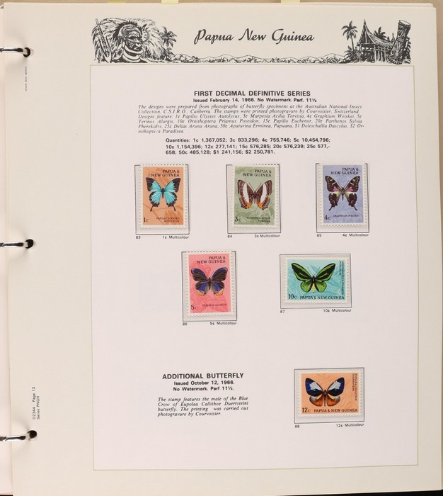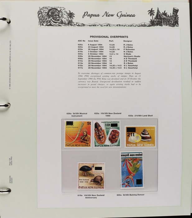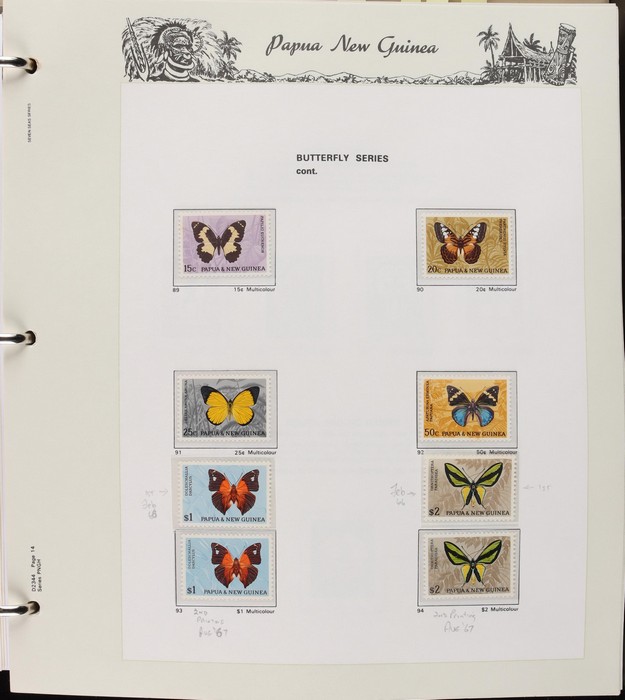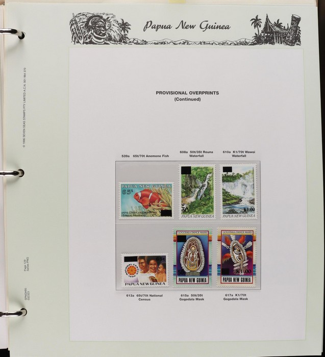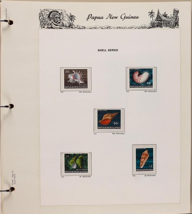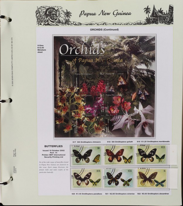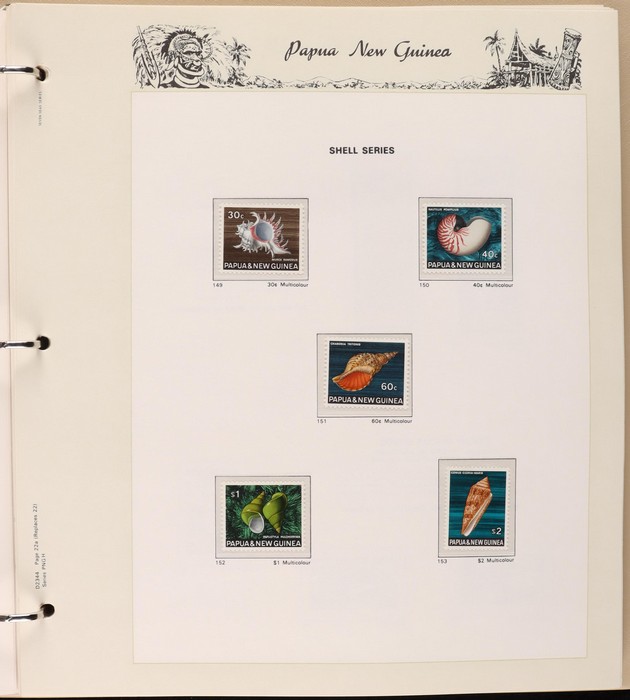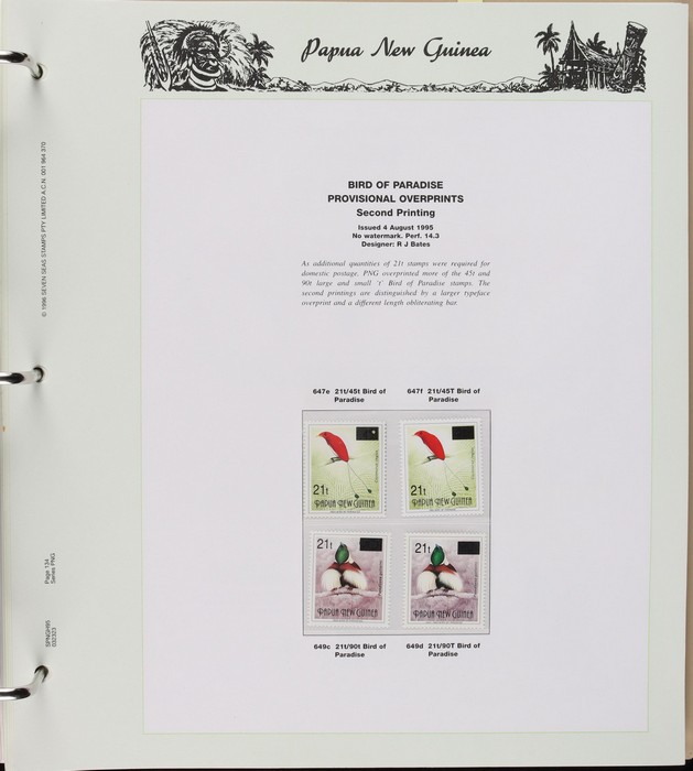 957 imagePapua New Guinea: 1952-2001 virtually comp MNH collection in Seven Seas hingeless album (retail $375) inc 1952 Pic set (10/- M, £1 MNH). 1963 Defs to QEII £1, 1964 Birds to 10/- & 170 decimal Pic/Commem sets to 2000 Olympics (plus 18 M/sheets) inc 1966 Butterflies, 1969 Shells, 1973 Panorama, 1992 Birds to 10K, 1994 Provisional opt set of 11 (retail $300), 1995 Bird opt set of 4 & 1999 Exhibition M/sheet. Except for a few 1950s pre-decimals, all fresh MNH. Total retail around $1800 inc the hingeless album. (Image1) (Image2) (Image3) (Image4) (Image5) (Image6) (Image7) (Image8) (Image9) (Image10) (Image11) (Image12)