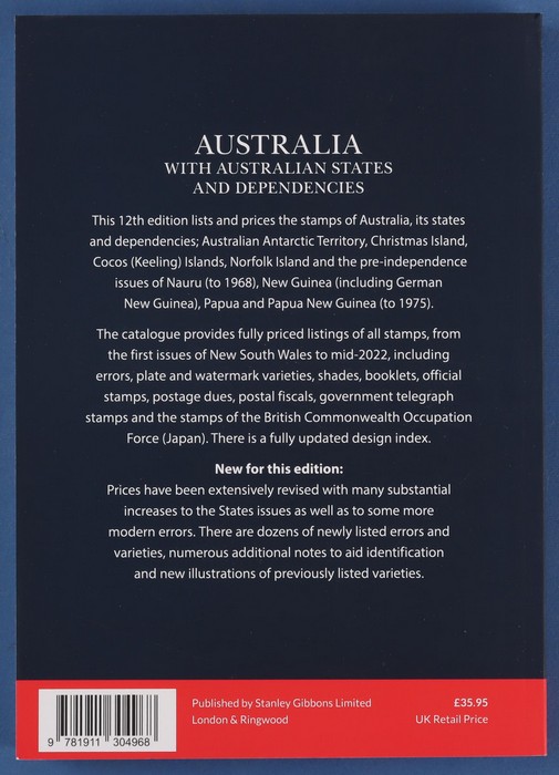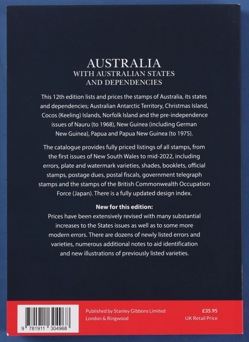 Specialised Catalogue inc States, Territories, AAT, Christmas Is, Cocos Is, New Guinea, Norfolk Is, Papua & PNG to 1975, plus BCOF opts. Current 2022 edition, 426 colour pgs. New, retail ?36, plus shipping. (Image1) (Image2)