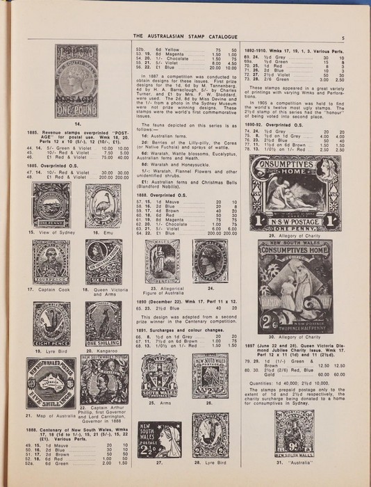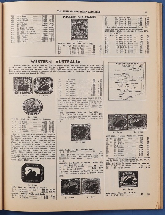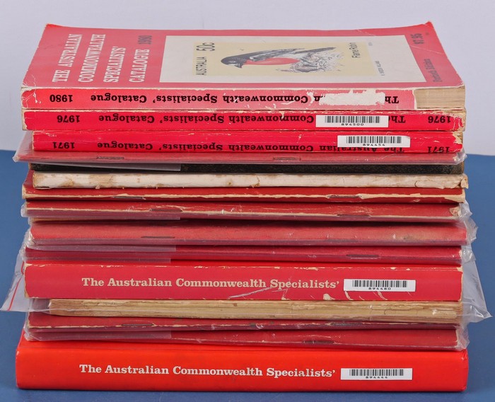 Library with 28 diff editions inc 8th edition (1945), 15th edition (pub by Aust Stamp Auctions 1953), 16th edition (Hawthorn Press 1955), 30th edition (front colour cover, 1969), 14th edition 1980 (last Hawthorn Press edition) & 41st edition, pub