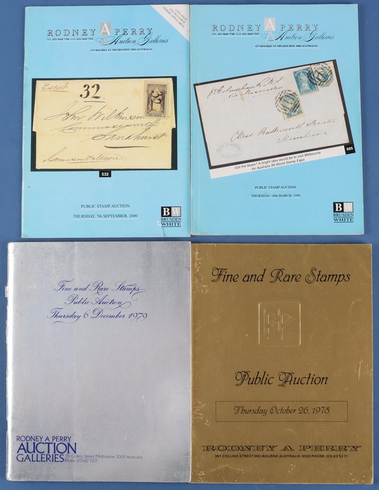 Perry Fine & Rare Stamps auction catalogues with 14 colour plates. Also Mar 1999 & Sep 2000 general sale catalogues. All F-VF condition. (4) (Image1)