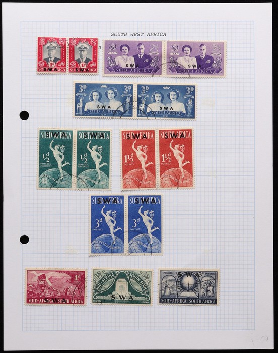 1003 imageSouth-West Africa: 1937-52 KGVI used collection on pgs inc 1937 Train 1½d long pr, 1937 Coronation set long prs. 1941-43 War Effort to 1/-. 1943-44 Bantam to 1/-, 1945 Victory set horiz prs, 1948 Silver Wedding blk of 4, 1947 Royal Visit set long prs, 1949 UPU set long prs & 1949 Voortrekker set. All diff. VFU. SG cat £120. (75) (Image1) (Image2) (Image3) (Image4)
