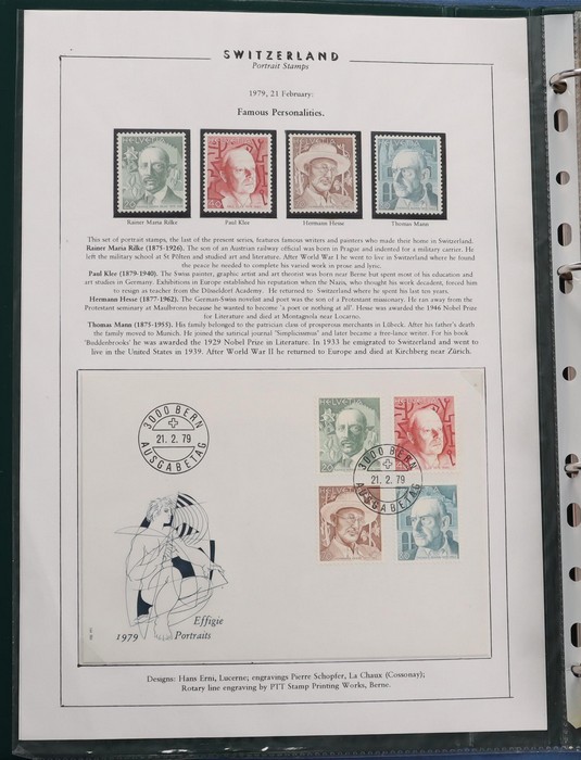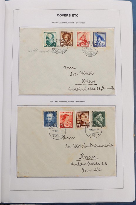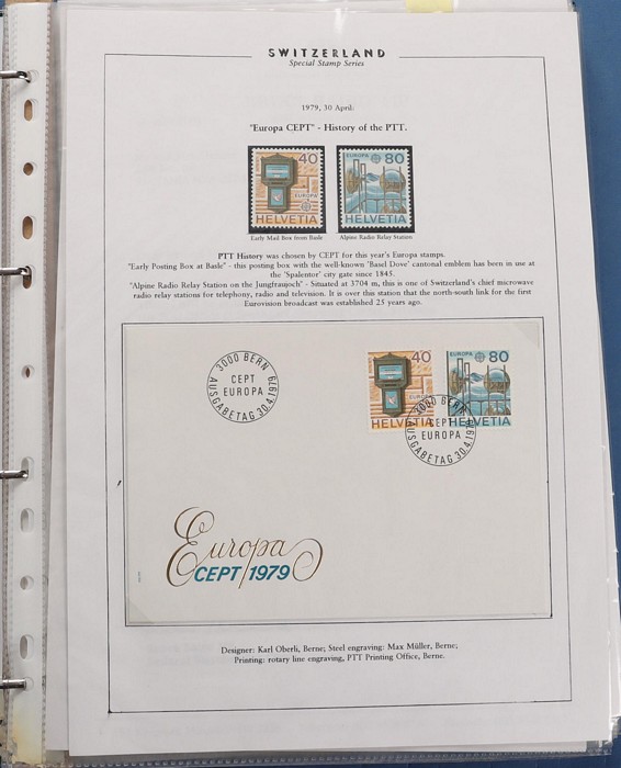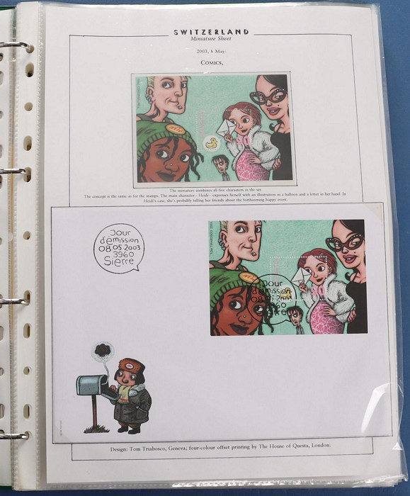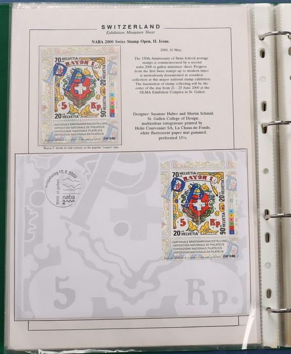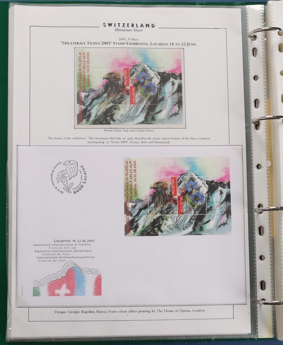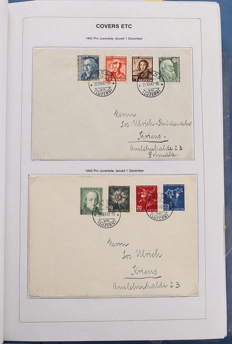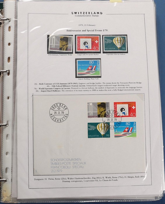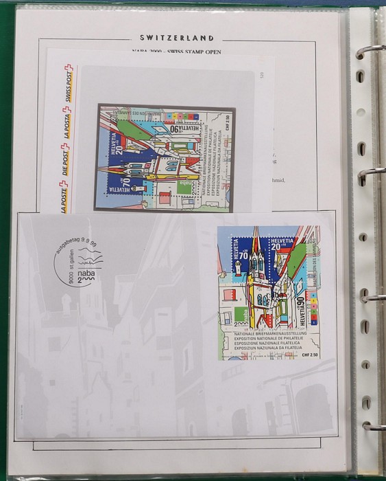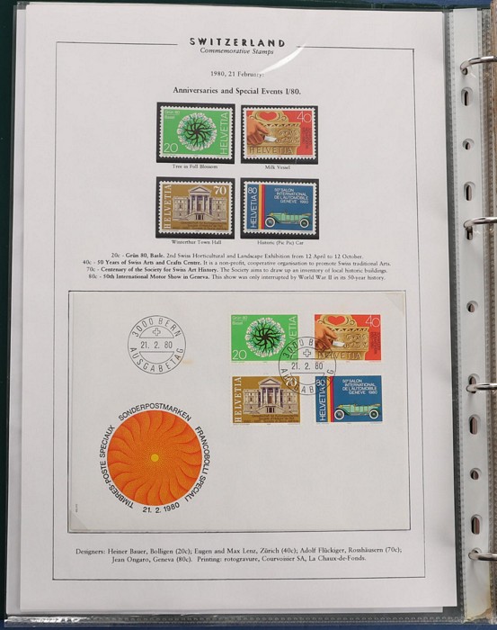 1009 imageSwitzerland: 1976-2008 collection in 9 binders, comprises mainly VF MNH, some M/S, then FDCs 1938-2011 earlies covers are mixed condition but nice from 1950s inc Pro Juventute FDCs, mostly all diff, many comp sets inc Seasons Greetings Cards from Swiss Philatelic from 1980-2008. Generally F-VF MNH, Mi est cat €2500 for covers while stamps MNH are FV of SFr700 alone so A$6000+. (700, 20 M/S, 500+ covers) (Image1) (Image2) (Image3) (Image4) (Image5) (Image6) (Image7) (Image8) (Image9) (Image10) (Image11) (Image12) (Image13) (Image14) (Image15) (Image16) (Image17) (Image18)