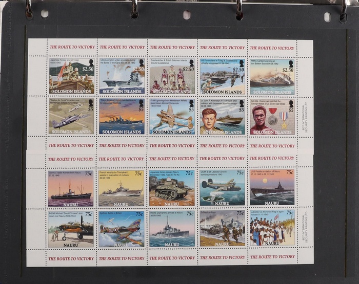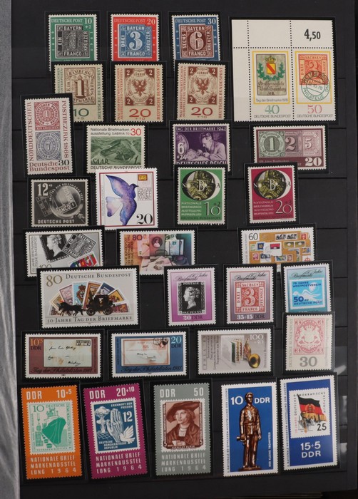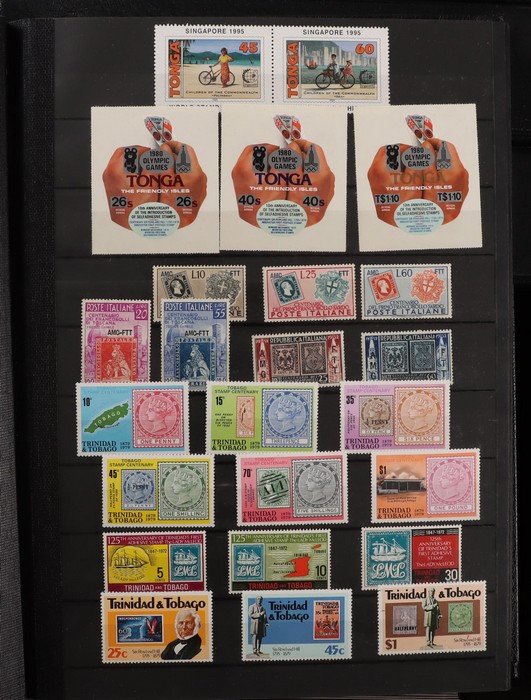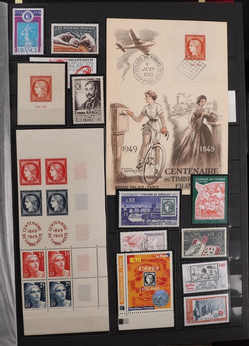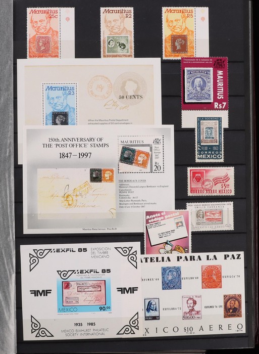 1011 imageThematic Stamps-on-Stamps collection A-Z in s/books & binders mostly Mint but also inc some covers, Cinderellas etc. Noted Argentina 1979 Stamp Exhibition M/Sheet set of 4 SG 1646/49 (cat £172), Australia 1950s-c2000 sets & M/Sheets inc 1999 Navigators M/Sheet double perf & others FV $50, Belgium 1925 Anniv set M (cat £75), Brazil 1938-93 inc 1938 Exhibition M/Sheet, 1941 Stamp cent & M/S (2 of) 1941 Air, stamp cent M/S MNH & others (cat £240), China & Taiwan 1972-90s sets & M/Sheets (FV £110+), Cuba 1940-2000 inc 1955 Air Exhibition M/S, 1986-91 History MNH etc (cat £250+), France 1949-2000 inc 1949 10Fr Stamp Cent M & Used on Commem Postcard etc (cat £200), French Polynesia 1974-97 inc 1974 100Fr UPU, 1993 Officials set MNH etc (cat £160), Germany West 1949-80s inc 1949 Stamp Cent set MNH & on FDC, 1951 NBA set MNH etc (cat £400+), Hungary 1950-99 inc 1950 PO Museum set MNH, 1951 50th Anniv set, 1962 Stamp Day M/Sheet perf & imperf (2) MNH, 1965 Stamp Day set imperf & M/Sheet perf, imperf MNH, 1976 Italia M/Sheet perf & imperf MNH & others (cat £500), Italy 1951 Tuscany Stamp Cent MNH & Trieste set MNH & others (cat £170+), Japan 1921 50th Anniv set M(cat £360), Korea North & South sets & M/Sheets Mostly MNH (cat £160), Philippines 1954-98 inc 1954 Stamp Cent M/Sheet M, 1977 Espamer Amphilex, 1984 Ausipex, 1998 Exhibition set of 8 M/Sheet MNH etc (cat £200+), M/Sheet, 1943 Cent M/Sheet MNH etc (cat £260), Sweden 1955 Stamp Anniv set of 4 imperf & a range of imperf colour separations etc (30 diff) MNH, Uruguay 1921 Air opt set M (cat £30). These are but a selection of items, there are many other sets & M/Sheets not catalogued. With close to 4000 stamps with approx 1000 sets/issues & 780+ M/Sheets in total. Total cat value approx £5000+ = A10,000+. A tremendous array largely VF. (3950+, 780 M/S) (Image1) (Image2) (Image3) (Image4) (Image5) (Image6) (Image7) (Image8) (Image9) (Image10) (Image11) (Image12) (Image13) (Image14)