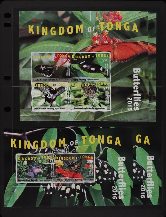 1018 imageTonga - Kingdom: 2015-16 Butterfly to $89 set of 6 (2 sets), FV $722. Tonga-Niuafo'ou 2015-16 Butterfly set of 6 to $89 (2 sets), FV $722. All fresh MNH. Total FV $1444. SG cat £1194 = A$2400. (8 M/S) (Image1) (Image2)