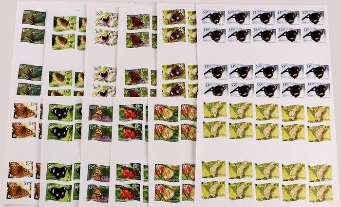1019 imageTonga - Niuafo'ou 2012 Butterflies sets of 12 to $8 both imperf & perf sheets of 20. FV T$1860 = A$1185. SG 352-63 cat £1680 = A$3350, plus premium for the imperfs which were sold at a substantial premium over FV. (40 sets) (Image1) (Image2)