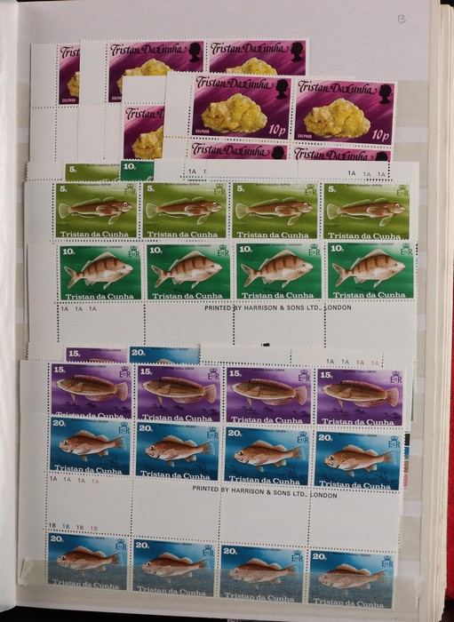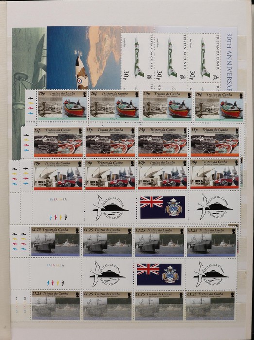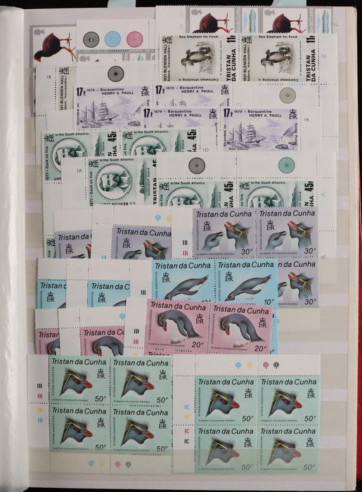 1023 imageTristan da Cunha: 1971-2015 specialist collection crammed into 2 s/book mainly comp sets in blks of 4, 8, 12. Mostly blks with colour plate numbers & registration markings, as well as imprint blks with printer details etc. Very extensive collection inc 1972 Flowering Plants x 4 diff sets of blks, 1994 Ships x 4, 2000 Monarchs x 4, 2005 Birds x 2 etc. Seems all fresh VF MNH. SG cat £9800+ = A$19,500+. Fantastic modern collection. (4800 + 50 M/S). (Image1) (Image2) (Image3) (Image4) (Image5) (Image6) (Image7) (Image8)