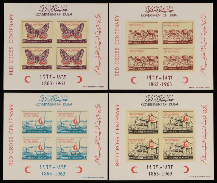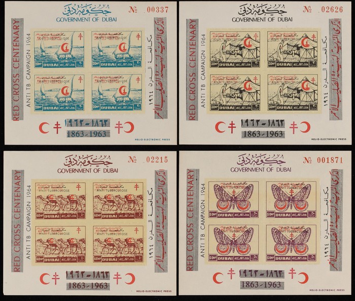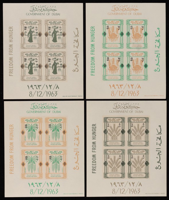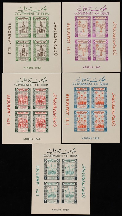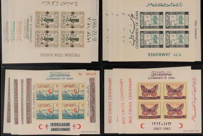 1030 imageUnited Arab Emirates: 1963-34 Dubai M/Sheet collection with 1963 Red Cross set of 4, & Freedom from Hunger set of 4. 1964 Scout set of 5 & Anti Tuberculosis opt Red Cross set of 4. VF fresh MNH. SG MS33b MS46a, MS59a & MS104c cat £415+. (17). (Image1) (Image2) (Image3) (Image4) (Image5)