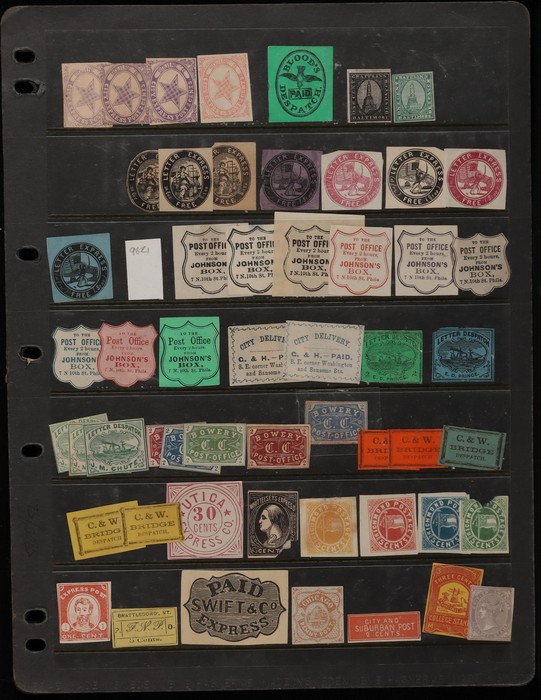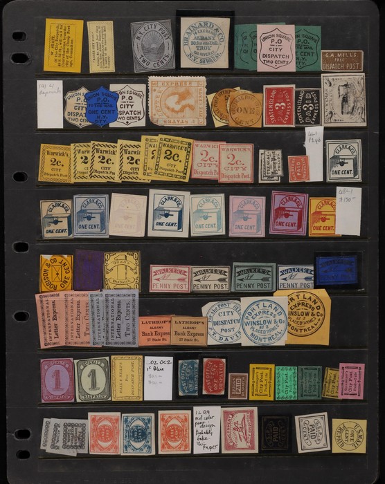 1032 imageUSA - Local Post: 1844-70s collection of early reprints & forgeries plus Fantasy issues mentioned in Melville's Classic Phantom Philately. Noted 1860s Mormon 5c. 1850s Baldwin's Railroad 2d. Westerfeld's Indian Express. 1844 Letter Express. Confederate States Buck's Express & Richmond Postage. Steamship McRobish & Co 1R. Wyman's 1894 Train 5c (original is the 1st stamp to depict a train). Also a selection of 1930s & 40s Philatelic Exhibition labels. Mostly G-VF UN as made. (400) (Image1) (Image2) (Image3) (Image4) (Image5) (Image6) (Image7)
