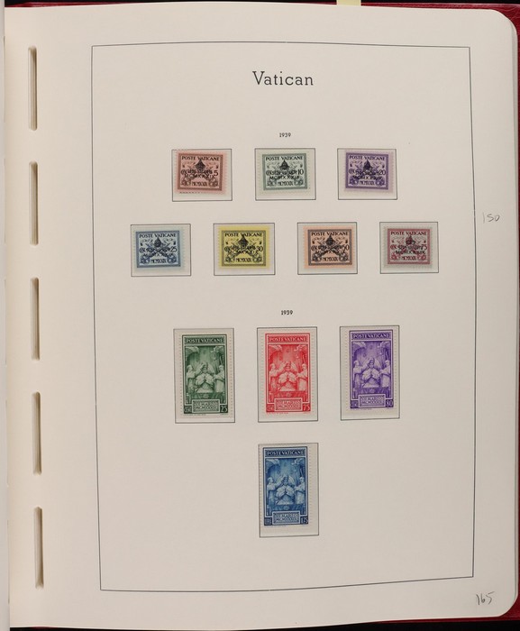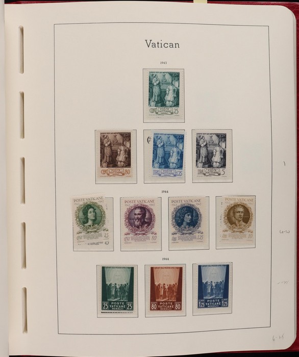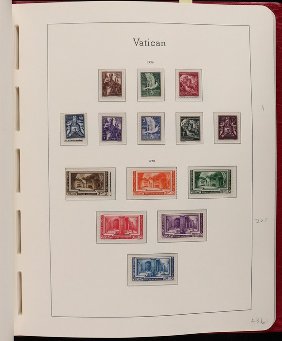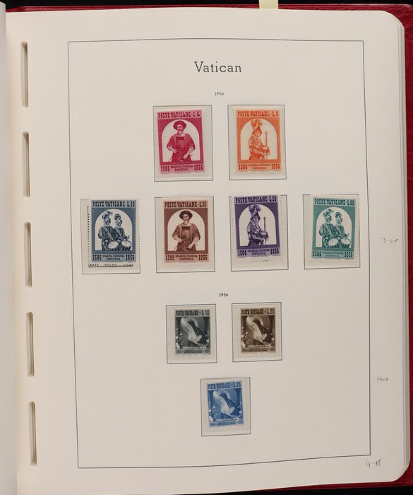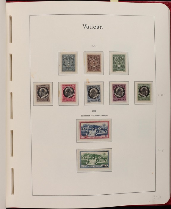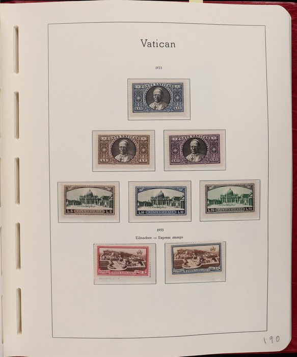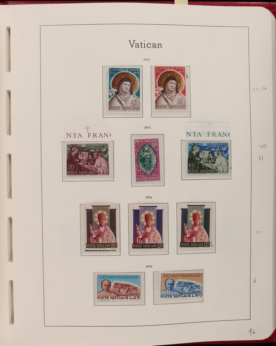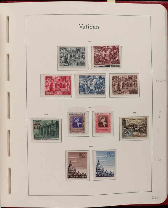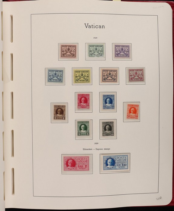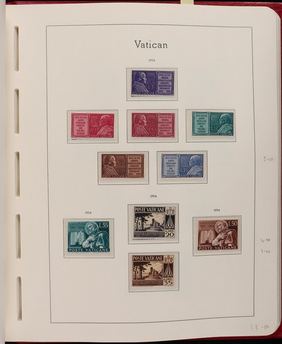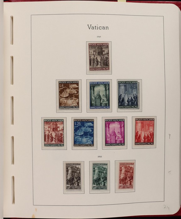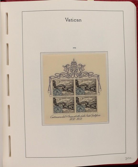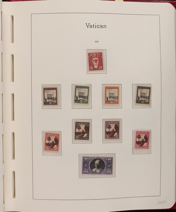 1039 imageVatican: Mint collection 1852-1987 almost comp in Lighthouse hingeless album & s/book. Papal States 1852 Arms 3b & 5b, 1867 Cents to 20c & 1868 perf to 80c, 1929 Pope & Arms set to 10L inc express (Sass cat €250), 1933 Holy Year set to 1.25L (€175), 1933 Pope Pictorial set to 20L (€190), 1934 Congress set (€1100), 1936 Exhib to 5L (€380+), 1938 Congress set to 1.25L (€225), 1939 'Sede Vacante' opt set to 75c (€150),1947 Air set to 100L, 1948 Air 250L, 1949 Pope & buildings set to 100L inc express (€170), 1951 Chalcedon set to 100L (€110+), 1953 Air set (€130), 1952 Stamp Cent M/S (€250), 1953 Lombard 100L, 1953-78 appears comp inc 80+ sets. S/book with 1979-87 inc 30+ sets, 1931 Postage Due opt set to 1.10L (€150). All diff, neat & clean. Mostly VF fresh MNH, odd M earlier. Mixed condition in Papal States as expected. Sass cat €5900 = A$10,000. Seldom offered this comp. Nice lot. (950, 7 M/S) (P) (Image1) (Image2) (Image3) (Image4) (Image5) (Image6) (Image7) (Image8) (Image9) (Image10) (Image11) (Image12) (Image13) (Image14) (Image15) (Image16) (Image17) (Image18) (Image19) (Image20) (Image21) (Image22) (Image23) (Image24) (Image25) (Image26) (Image27)