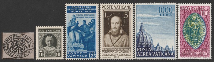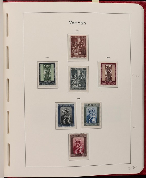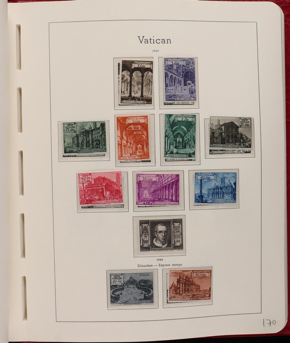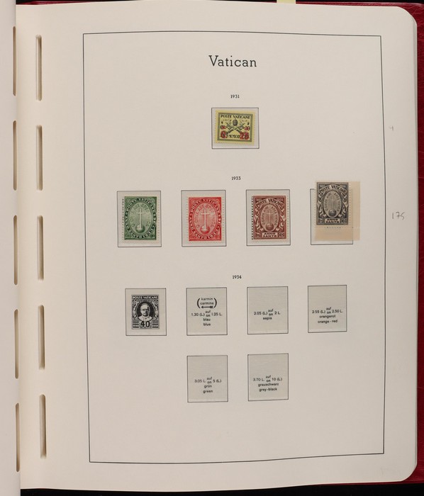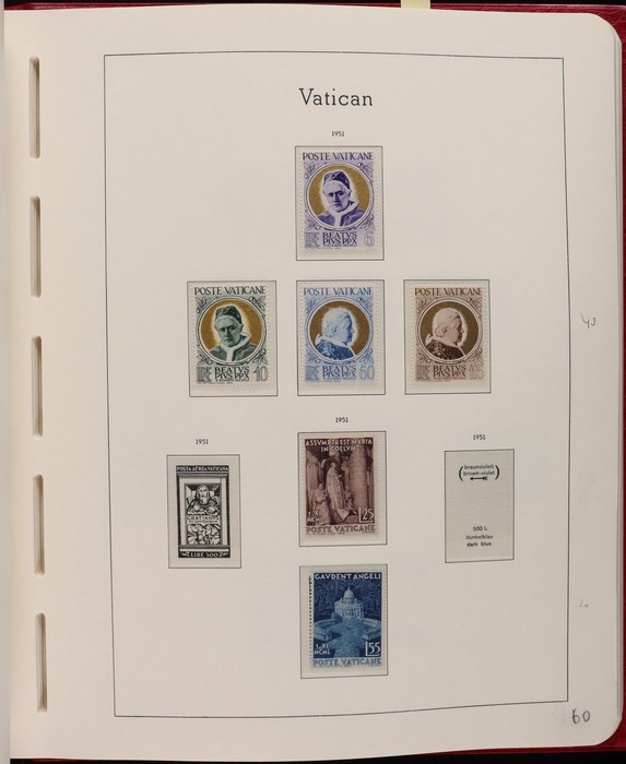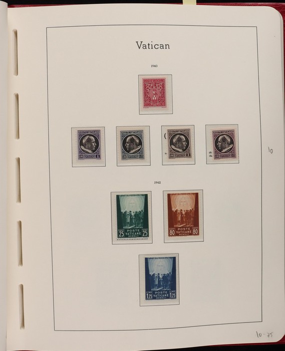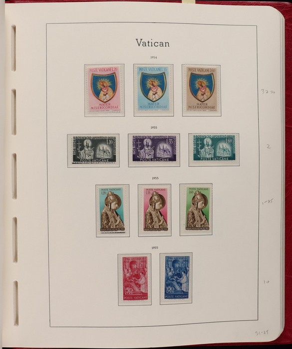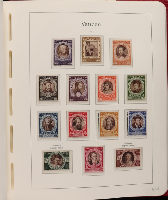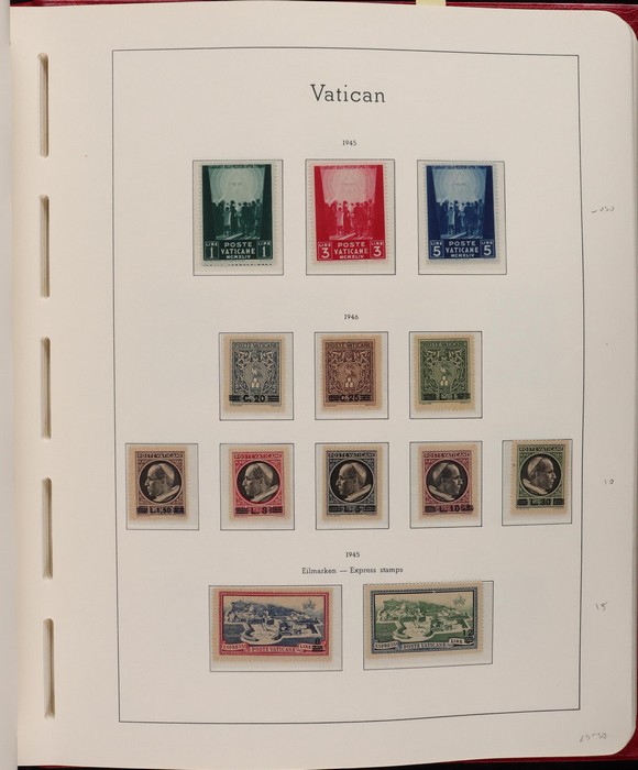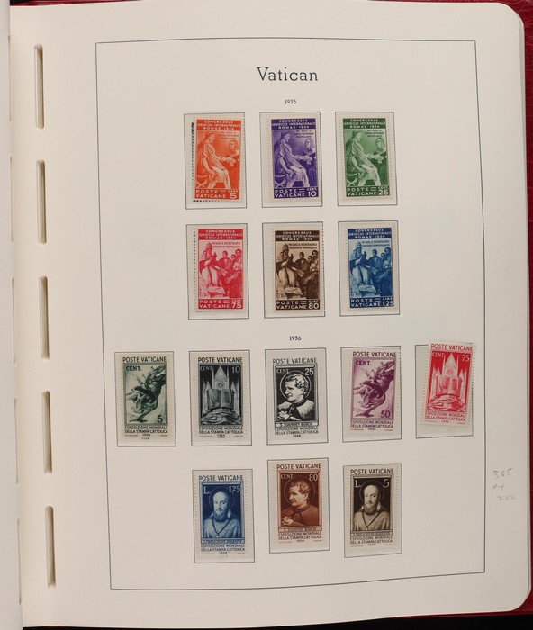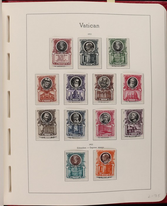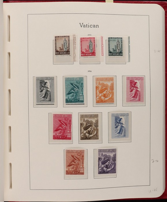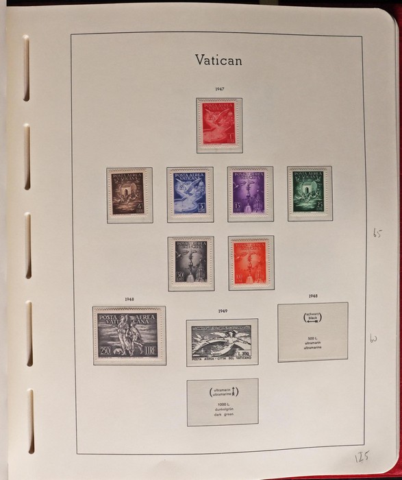 1039 imageVatican: Mint collection 1852-1987 almost comp in Lighthouse hingeless album & s/book. Papal States 1852 Arms 3b & 5b, 1867 Cents to 20c & 1868 perf to 80c, 1929 Pope & Arms set to 10L inc express (Sass cat €250), 1933 Holy Year set to 1.25L (€175), 1933 Pope Pictorial set to 20L (€190), 1934 Congress set (€1100), 1936 Exhib to 5L (€380+), 1938 Congress set to 1.25L (€225), 1939 'Sede Vacante' opt set to 75c (€150),1947 Air set to 100L, 1948 Air 250L, 1949 Pope & buildings set to 100L inc express (€170), 1951 Chalcedon set to 100L (€110+), 1953 Air set (€130), 1952 Stamp Cent M/S (€250), 1953 Lombard 100L, 1953-78 appears comp inc 80+ sets. S/book with 1979-87 inc 30+ sets, 1931 Postage Due opt set to 1.10L (€150). All diff, neat & clean. Mostly VF fresh MNH, odd M earlier. Mixed condition in Papal States as expected. Sass cat €5900 = A$10,000. Seldom offered this comp. Nice lot. (950, 7 M/S) (P) (Image1) (Image2) (Image3) (Image4) (Image5) (Image6) (Image7) (Image8) (Image9) (Image10) (Image11) (Image12) (Image13) (Image14) (Image15) (Image16) (Image17) (Image18) (Image19) (Image20) (Image21) (Image22) (Image23) (Image24) (Image25) (Image26) (Image27)