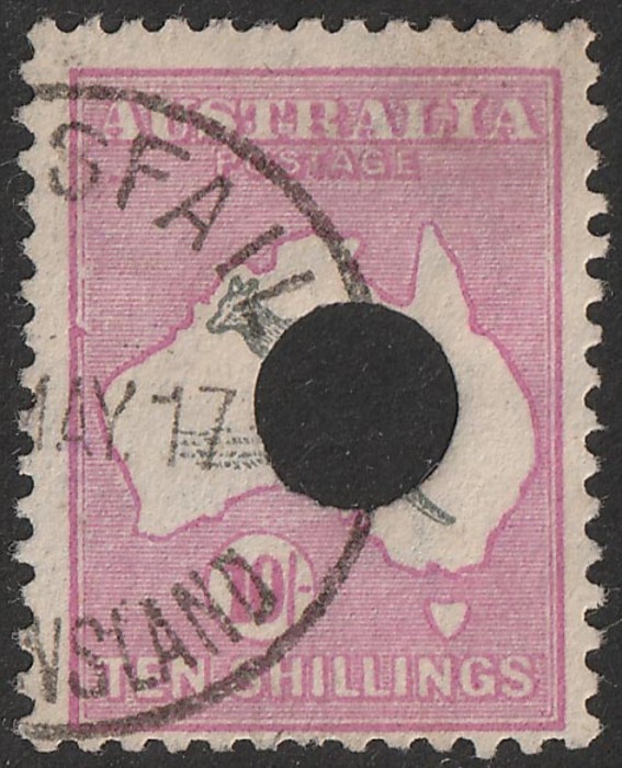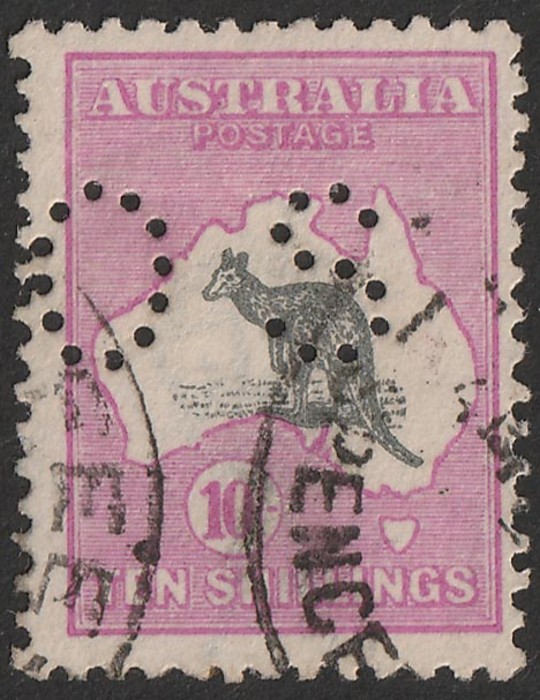 aniline pink perf OS with unlisted variety 'Spencers Gulf elongated' & perf OS is misplaced into the left margin. Postally FU. SG O51. ACSC 48Bba cat $800 should be worth much more than double for varieties. Much scarcer than the usually seen CTO
