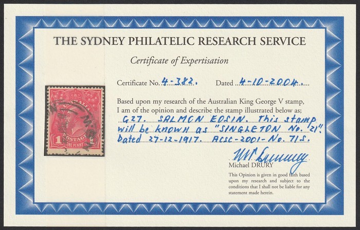 (G27). VFU, with part 'Singleton 27 Dec 17' cds. SG 21(var). ACSC 71S cat $1800. 2004 Drury photo-cert. (P) (Image1) (Image2)