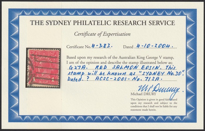 eosin. FU, part Sydney cds. SG 21(var). ACSC 71SA cat $2000. 2004 Drury photo-cert. (P) (Image1)