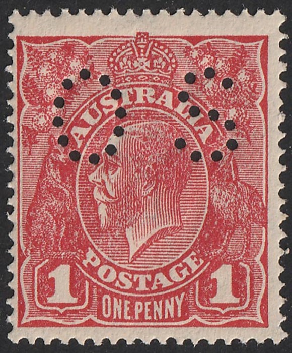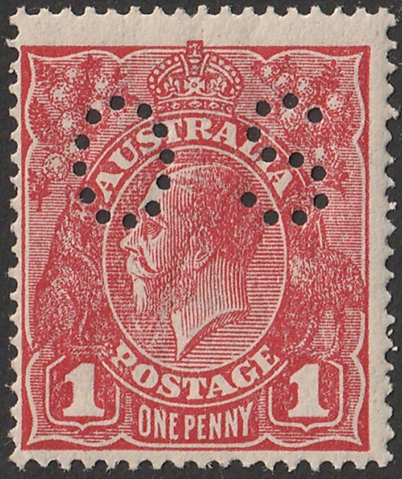 G109 (carmine red) G110 deep red. Scarce Private Perfin V.O Co. The Die III was issued in July 1918 & only used for NSW & Tasmania official purposes. A small number were used for company perfin usage. VFU. SG 53(var), ACSC 75A/B (carmine red) cat