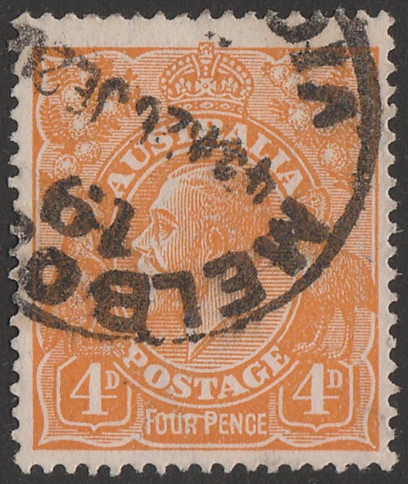 major variety 'line through FOUR PENCE' (2R12). U, part 'Melbourne 26 JE 20' well clear of variety. SG 22e cat £110. ACSC 110H(2)r cat $300. (Image1)