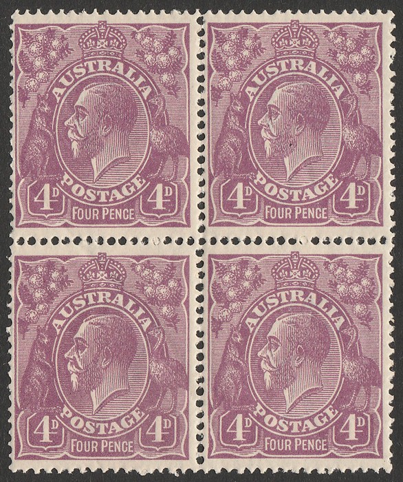 SG O73(var), ACSC 111A(2)h & i cat $1700 as 4 MNH singles. Varieties cat nearly 4 x normals so this blk should cat double $3400 or more. Rare multiple. (P) (Image1)