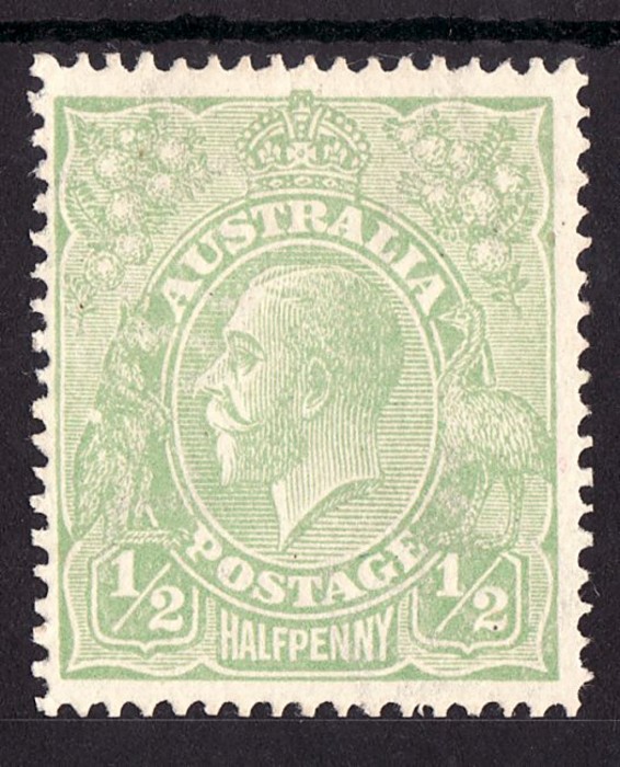 green, 'cracked electro - second state, left wattles to forearm of Kangaroo (5L46). VFU. SG 48(var). ACSC 65A(5)ka cat $650. Pmk clear of variety. (P) (Image1)