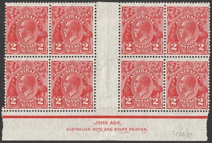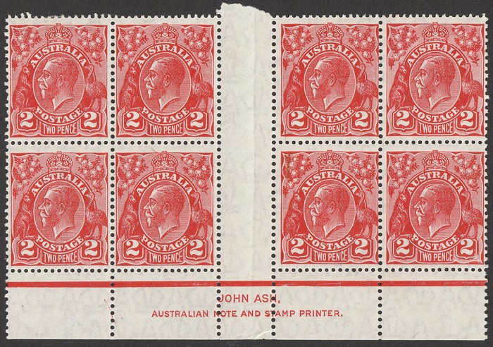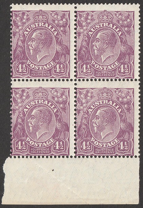 blk of 4, plated as 5R 32-33 & 5R 38-39 with varieties 'flaws on R of Australia' (5R33) & 'retouch ST of Australia' (5R38). Good positional piece. Fresh VF 2MLH / 2 MNH. 5R33 is M, 5R38 is MNH. SG 100b(var). ACSC 108Cf & g cat $240 M, should be at