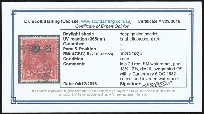 scarlet opt OS, error wmk INVERTED. VFU, nice cds, w/c. ACSC 102C(OS)a. SG O125w cat £1000. Rare. 2018 Starling photo cert. (P) (Image1) (Image2)
