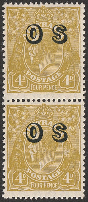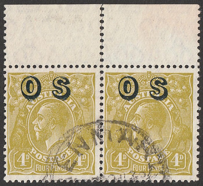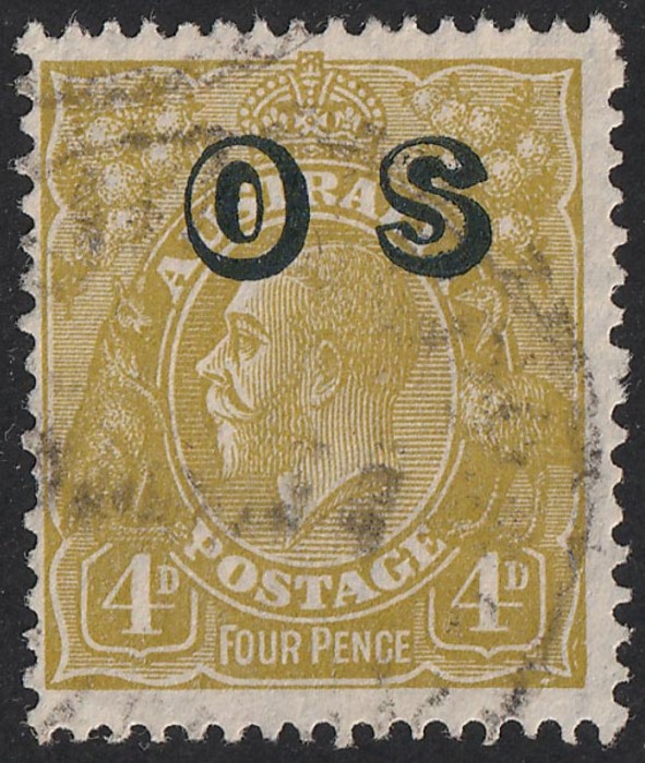 4 examples with OS opt in diff positions from top of the stamp to centre position, plus very heavy opt with duplication of the OS & likely a double opt. Interesting range. FU. SG O126, ACSC 116B(OS) cat $250 as standard OS. (5) (Image1)