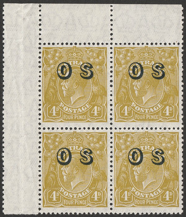 opt OS right pane upper marginal blk of 4. VF fresh MNH. SG O0126 cat £104, should be at least double, £200 MNH. ACSC 116(OS)B cat $320. (4) (P) (Image1)