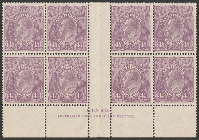 Dull-violet Ash imprint blk of 8. Superb fresh MNH. SG 103(var). ACSC 120Az cat $1000 for M, should be at least double, $2900 MNH. (8) (P) (Image1)