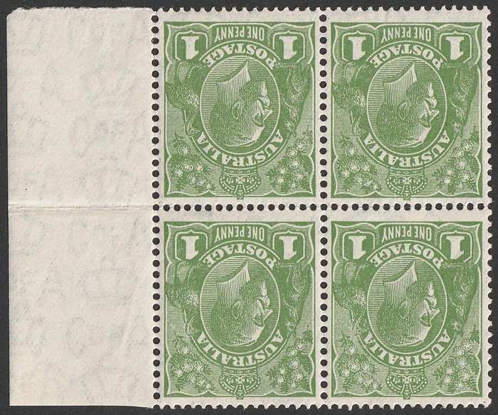 Die III John Ash imprint blk of 8 on thinner paper, unusually it shows some duplication of printing under Australia note etc. F-VF fresh 2 MLH / 6 MNH. SG 127(var). ACSC 103Bz cat $60 for Mint, should be at least double, $120 plus additional stamps.