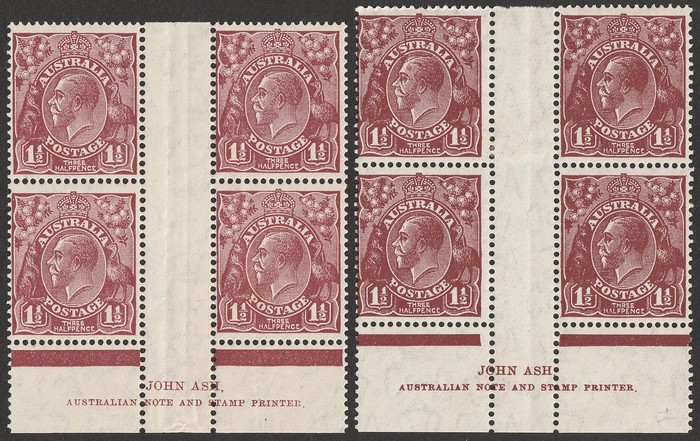 Red-brown Ash imprint blks of 4, Plate 1 & Plate 3 with the S of Ash damaged, an additional Plate 3 blk where the imprint has been guillotined immediately under the Ash imprint. Many blks were treated in this way. F-VF MLH/MNH. ACSC 93(1), (3)za cat