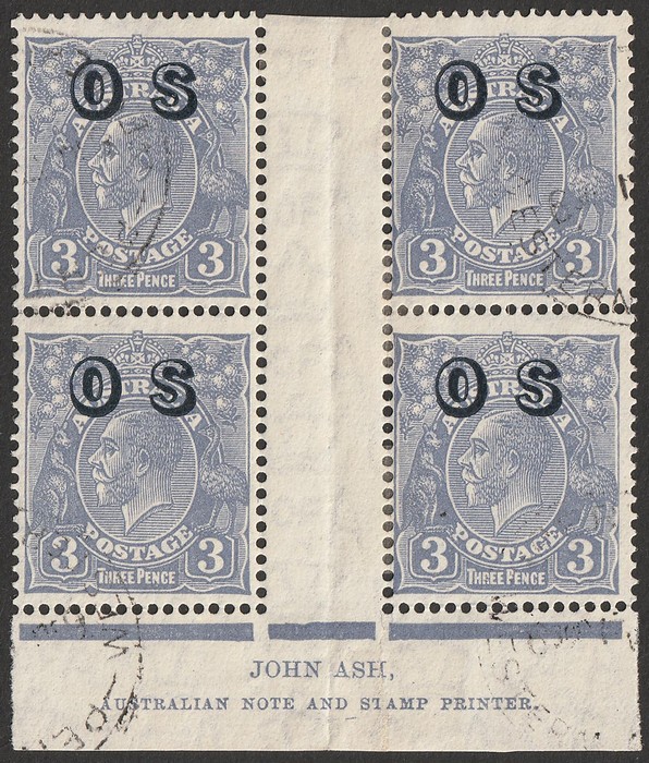 Ash imprint, plate 8, blk of 4 with Perth WA cds. FU, perf separation reinforced with hinges. SG O131(var). ACSC 109 A (OS) za cat $275 for Mint, much scarcer Used. (4)