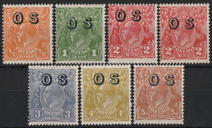 ½d-5d with SM wmk 2d red & 4d olive & CofA wmk ½d-5d. Fresh F-VF MNH. ACSC cat $305. SG O125-6 & O128-32 cat £152 M, should be at least double, £304. (7)