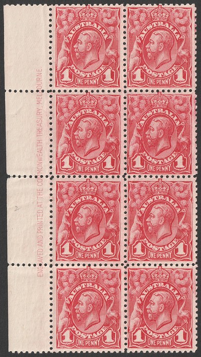 marginal pr 2R3 - R4 with 2R4 showing variety ' thin words of value'. F-VF fresh MNH. SG 130(var), ACSC 127Bh Mint flaw $125, should be at least double, $250 for normal is $290. (2) (Image1)