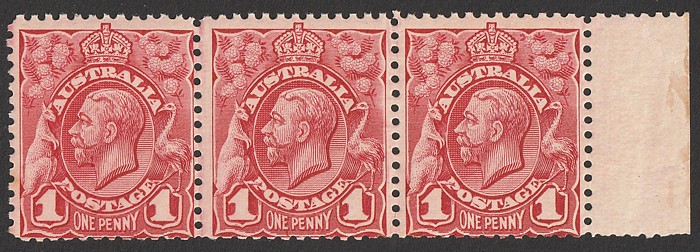 red KGV plate 2 marginal strip of 3 with Plate 2 major variety ACSC 59(2)U dash under E of One. This occurs on column 9 of the plate. F MNH. SG 17(var), ACSC cat M variety $40, should be double MNH & with other stamps = $130. (3) (Image1)