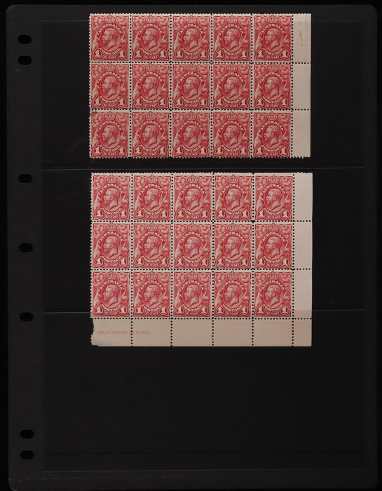 red KGV range of positional pieces inc part imprint blks of 4 & 6 from bottom of the sheet, 2 marginal blks of 6 & 3 pmks. Not checked for varieties. Generally F-VF M/MNH. Some gum toning. VF appearance. SG 17, ACSC 59A/B/C cat $270+. (28) (Image1) (Image2)