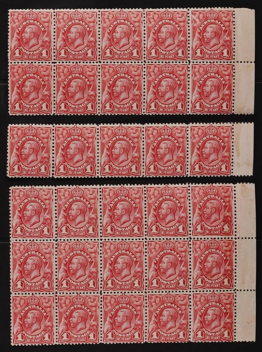 Red KGV carmine-red right marg strips & blks with margins inc strip of 5, blk of 10, 2 blks of 15, blk of 15 with part bottom imprint. Not plated but likely from 1 sheet, Stamps mostly VF fresh MNH.SG 17(var), ACSC 590c cat $720+. (60) (Image1) (Image2)