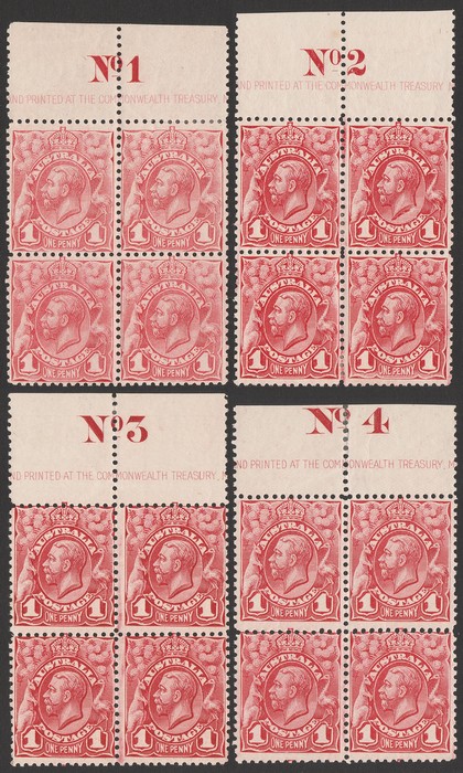 carmine red KGV plate numbers 1-4 set upper marginal blks of 4. Plate 1 rounded cnr, plate 2 thin spots in margin, all M/MNH. SG 17 (var), ACSC 59(var) cat $1500 as blks of 8.