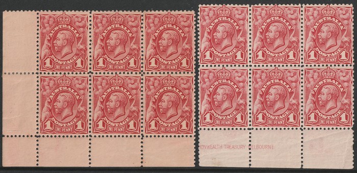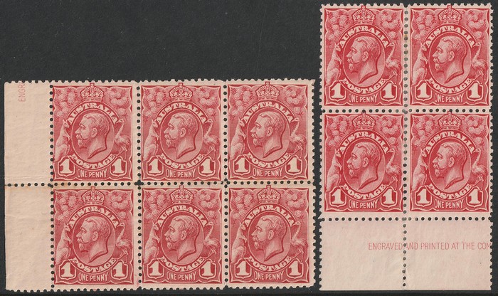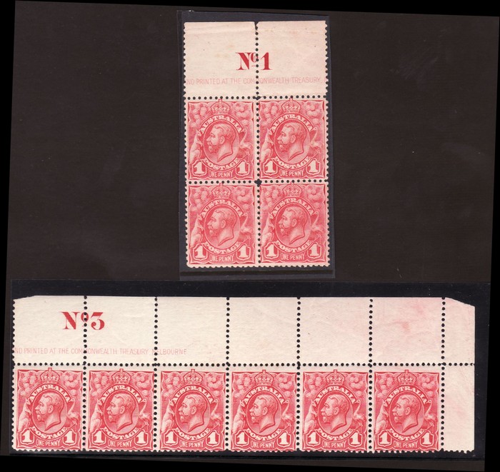 red KGV Plate 1 printing imprint blk of 4 & Plate 3 partial imprint strip of 6. MLH-MNH both have tone spots. SG 17(var), ACSC 59(1)z & 59(3)z. (6) (Image1)