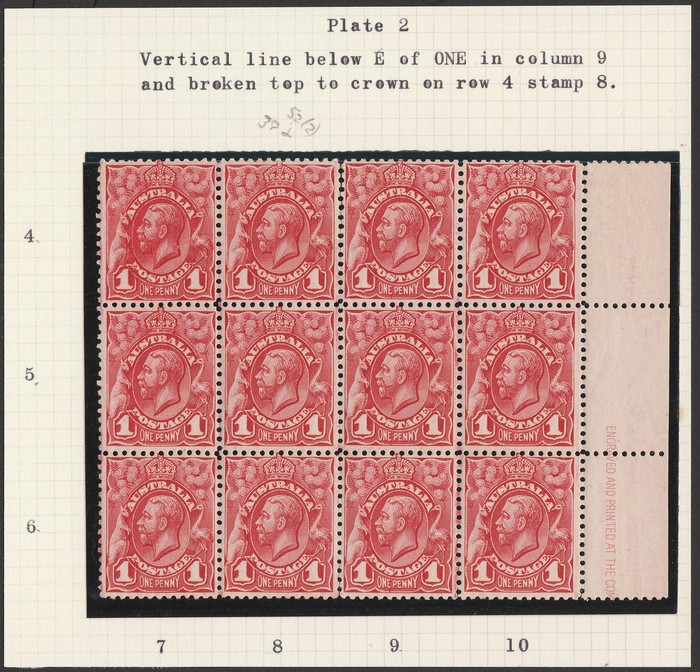 red KGV carmine red shade Plate 2 blk of 12 (perf separation), column 9 with ACSC constant variety 59(2)v 'dash under E' on 3 stamps cat $50 ea M, should be at least double, $300 MNH. SG 17(var), ACSC 59. Total cat $400+. (12) (Image1)