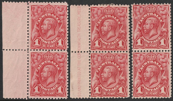 Red KGV carmine-red (shades) part imprints from left & right side, not plated. Generally F/VF M/MNH, only an odd tone or other flt. SG 17(var), ACSC 59(?)zb, zc cat $400+ as singles. (38) (Image1)