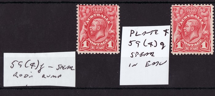 Red KGV plate 4 major varieties SG 17(var), ACSC 59(4)j spear in Roo's rump, ACSC 59(4)q spear in Emu. F-VF fresh MNH. ACSC cat M varieties at $50 ea, should be at least double, fro MNH = $200. (2). (Image1)