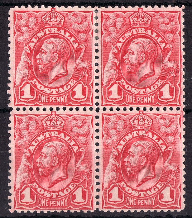 red KGV major varieties Plate 3 blk of 4 with ACSC 58(3)i retouch under R cnr & Plate 4 pr with ACSC B59(4)q spear in emu. F-VF M/MNH. SG 17(var), ACSC cat $130. (6)