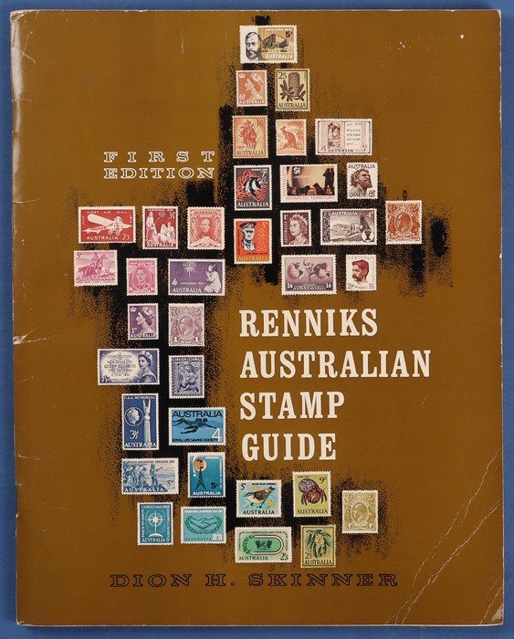 Stamp Guide by Dion Skinner. 1st edition 1967 with 92 pgs to 1966 AAT Decimal Pic sets. Cnr creasing, F-VF condition. Philatelic history. (Image1) (Image2)