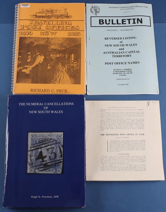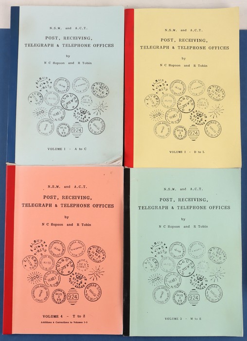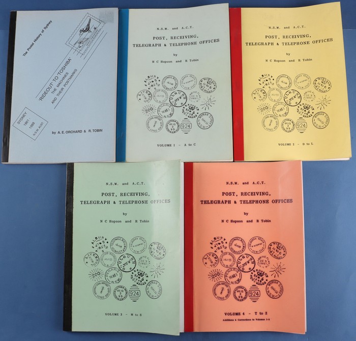 Wales Post Receiving, Telegraph & Telephone Offices by Hopson & Tobin - 4 vol set. NSW & ACT POs by N C Hopson. 'Rideout to Toshiba' The Machine & Their Postmarks by A E Orchard & R Tobin TPO's of NSW 1870-1985 by R Peck. 'Reversed Listing of NSW &